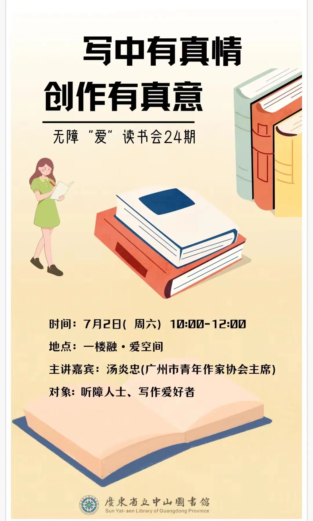 7月2日,廣東省立中山圖書館舉行無障“愛”讀書會第24期暨第四屆全國聽力殘疾人讀書征文大賽賽前培訓。本次活動采取線下和線上相結合形式,特邀廣州市青年作家協會主席湯炎忠作為主講嘉賓,與聽障人士和寫作愛好者交流創作方法。
