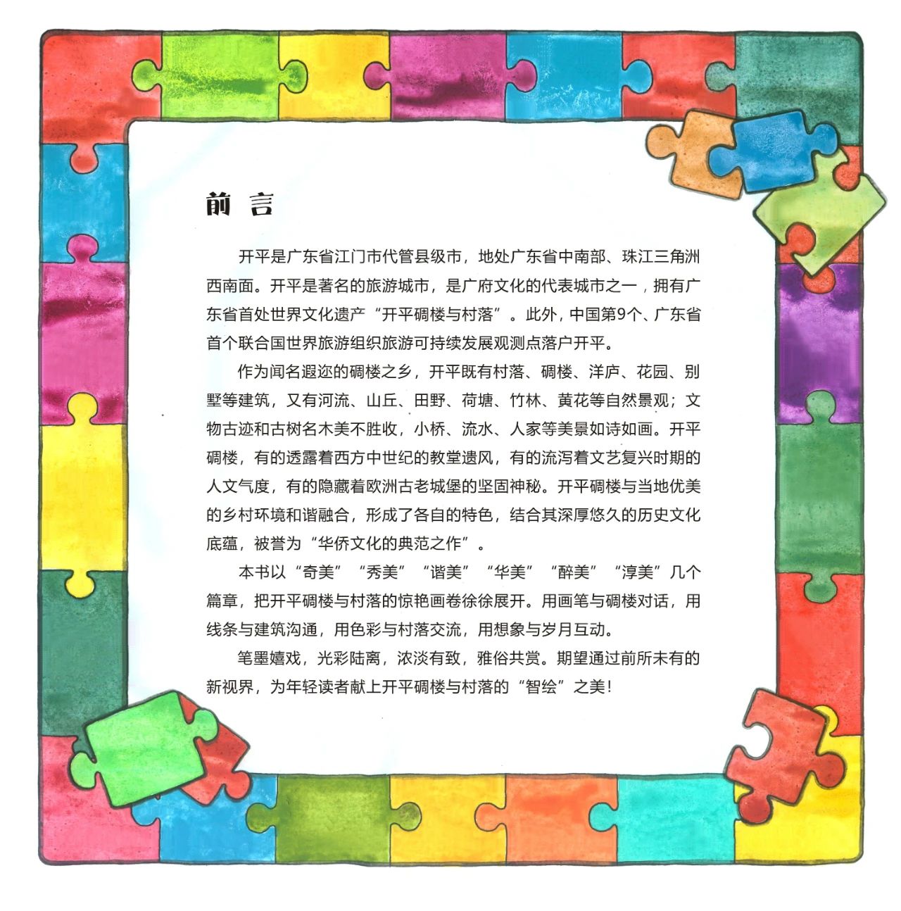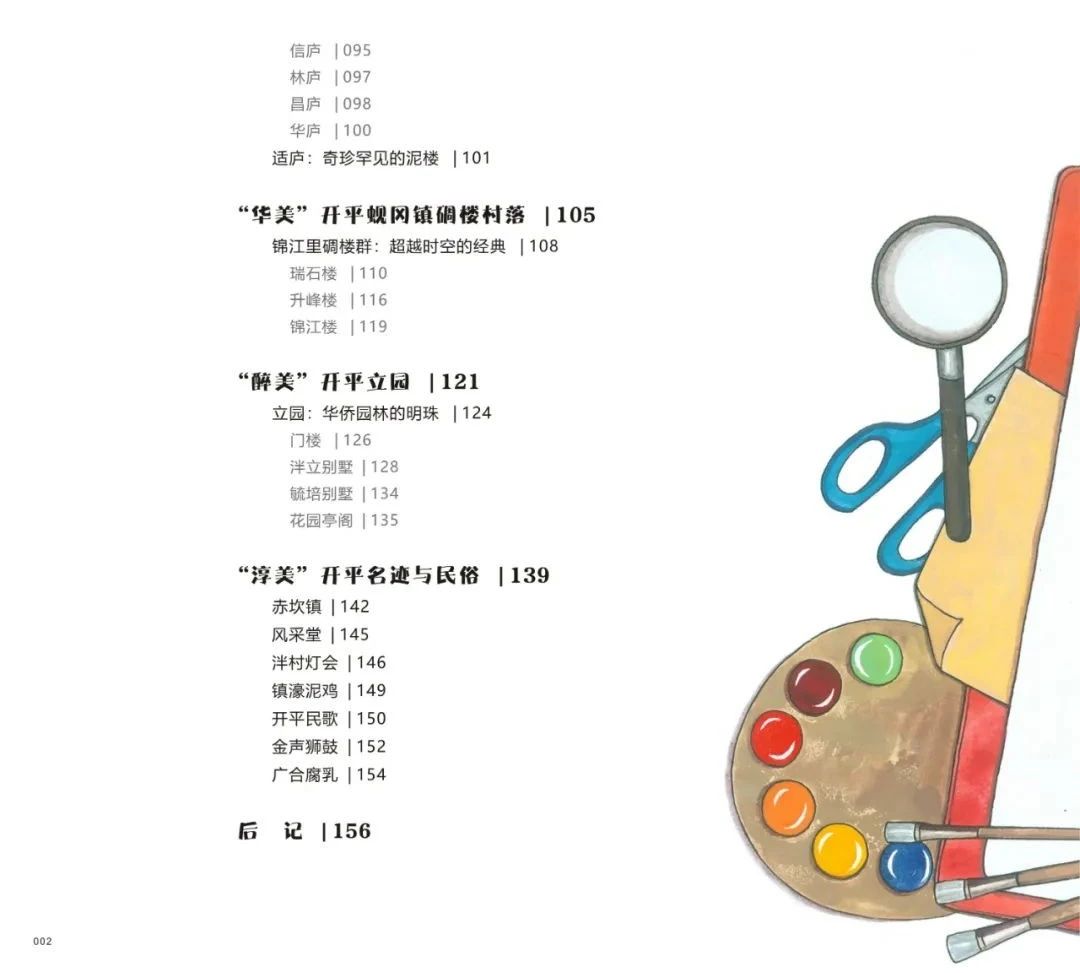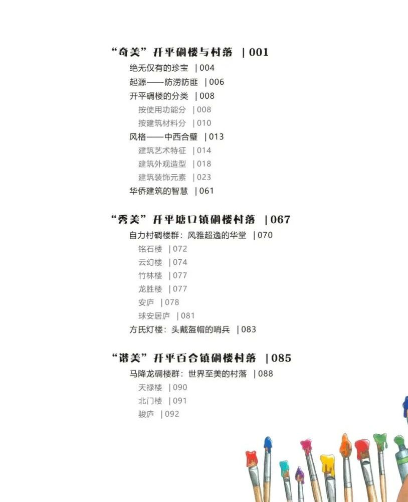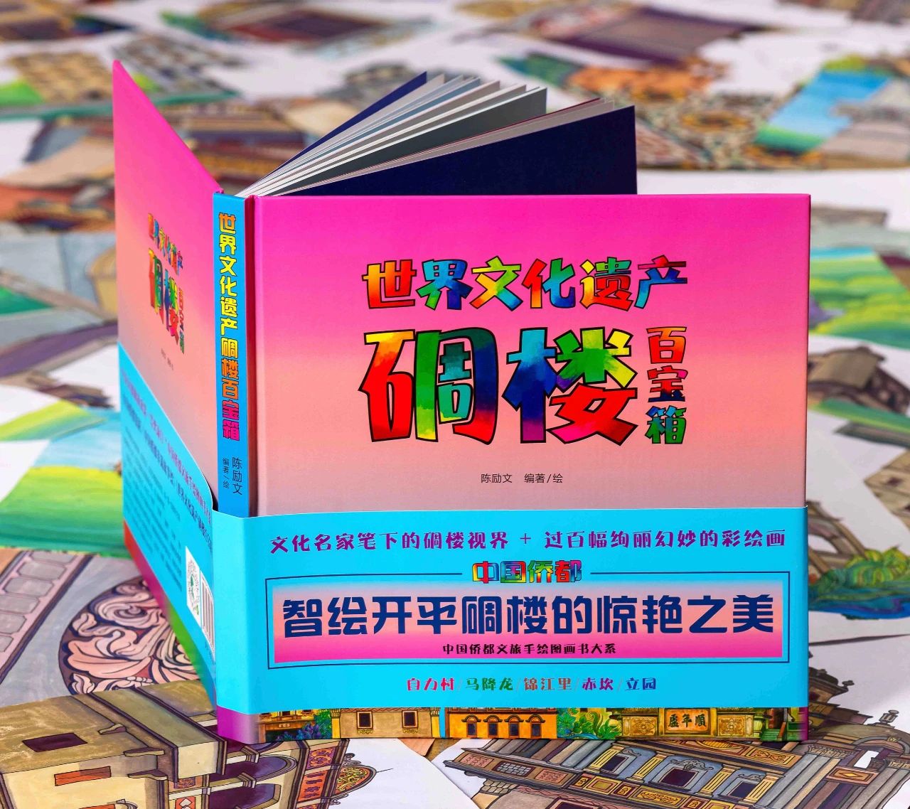 近期,陳勵文編著、繪畫的《世界文化遺產碉樓百寶箱》由廣州市青年作家協會策劃、廣東海燕電子音像出版社出版發行。 該書著重從科學知識原理、工藝方法技能、科學歷史價值等方面,深入淺出地介紹中國第35處世界文化遺產——開平碉樓與村落的科普價值和藝術價值。作者用時尚藝術繪畫的方式繪制碉樓形象,創作出開平碉樓與村落百科全書式的現代科普圖畫。以“奇美”“秀美”“諧美”“華美”“醉美”“淳美”等篇章,把開平碉樓與村落的驚艷畫卷徐徐展開,筆墨嬉戲,光彩陸離,濃淡有致,雅俗共賞。