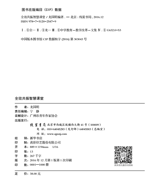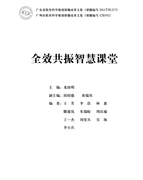 廣州開發區中學《全效共振智慧課堂——廣州開發區中學全效共振教育教學改革成果匯編》,于2017年6月由廣州市青年作家協會策劃、線裝書局出版。該書龍國明主編,是廣州開發區中學兩個課題研究成果文集,是全體師生辛勤勞動的成果。第一個課題是“123合作共振高效教學范式”有效性研究,是2011年廣東省教育科學規劃課題,課題類別是面上一般課題,課題批準號是2011TJK217,2011年9月正式開題研究,專家建議更名為“123合作共振高效教學范式”的研究與實踐。第二個課題是構建全效共振教學范式的研究,是2012年廣州市教育科學規劃課題,課題類別是面上一般課題,課題編號是12B192,下達單位是廣州市教育局,2013年4月正式啟動研究。該書由研究報告篇、“三級建模”篇、研究論文篇和優秀導學案篇四大板塊組成。主編簡介:龍國明,廣州開發區中學黨支部書記、校長。中學物理高級教師,全國優秀校長,廣東省中小學校長培訓中心客座教授,中國陶行知研究會教學法(講學稿)研究中心副理事長,中國教育學會物理教學研究會會員,廣東省中小學校長聯合會常務理事,廣東教育學會教育評價專業委員會常務理事,廣東教育學會校長領導力與學校優質發展專業委員會理事。